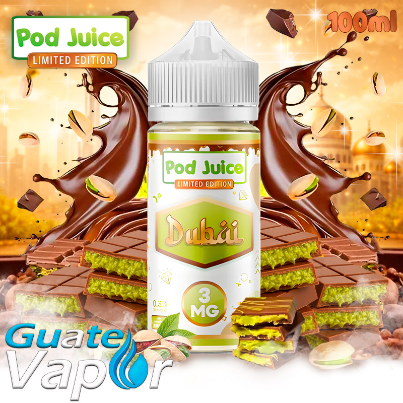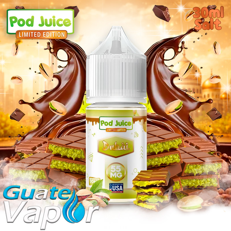Pod Juice presenta su edición limitada el Dubai edición limitada fue inspirado en el rico chocolate estilo Dubai, que es un sabor a chocolate de Dubái con infusión de pistacho. Inspirada en el lujo de la ciudad, esta rica mezcla con notas de chocolate envuelve tu paladar en una dulzura suave y aterciopelada. Cada calada es refinada y reconfortante, ofreciendo un sabor profundo, a postre, intenso pero perfectamente equilibrado entre chocolate y pistacho.